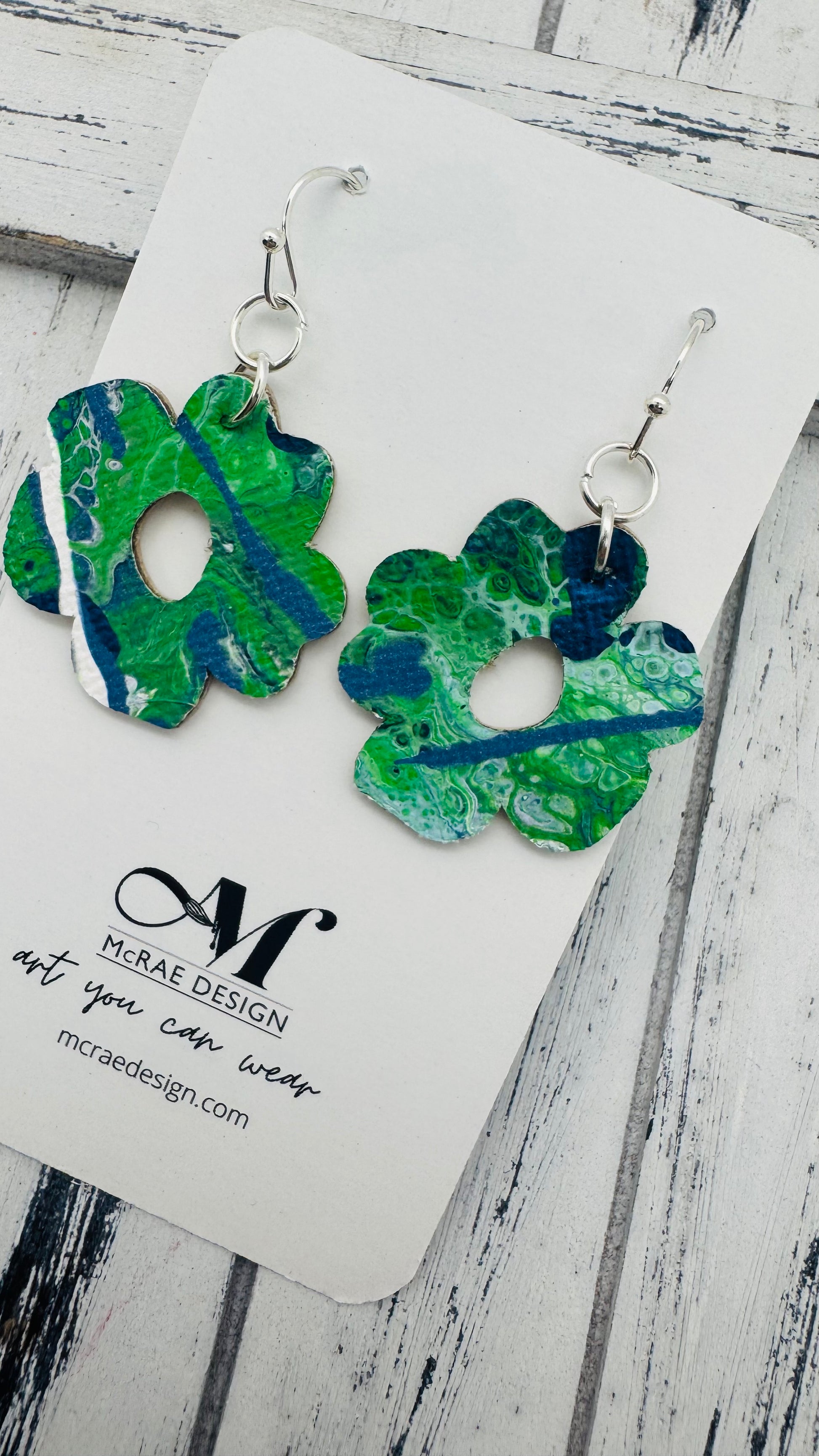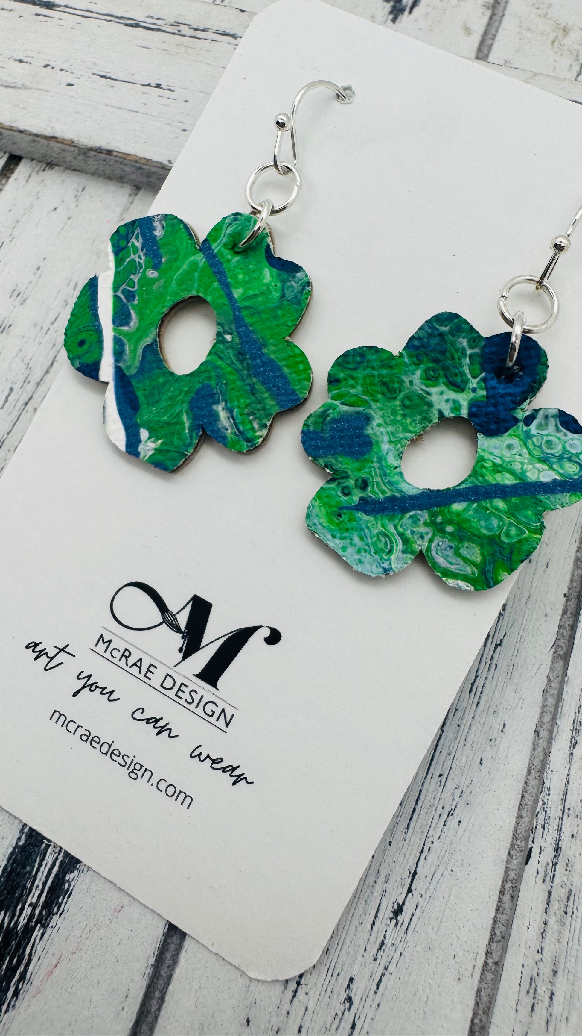 Meet Surfer Girl — a dreamy, salt-kissed collection of wearable art inspired by the shimmer of ocean waves and the nostalgia of endless summer days. Every pair begins as a hand-painted canvas, then carefully cut into oceanic silhouettes like mermaid tails, turtles, and sand dollars. With metallic navy blues, vibrant kelly greens, soft Carolina blue, and bright whites, these earrings echo the rhythm of tides and the sparkle of sunlight on the sea.