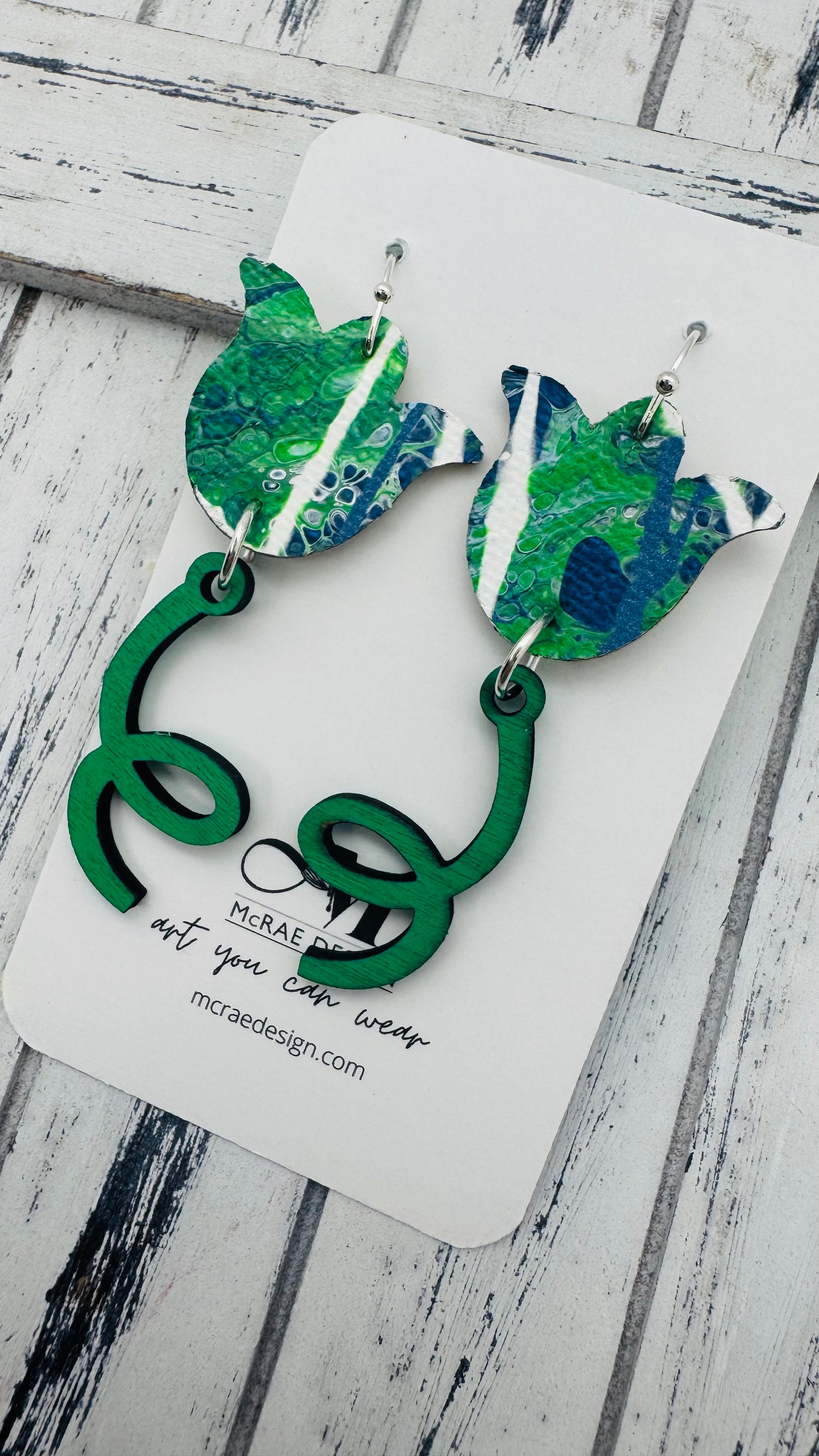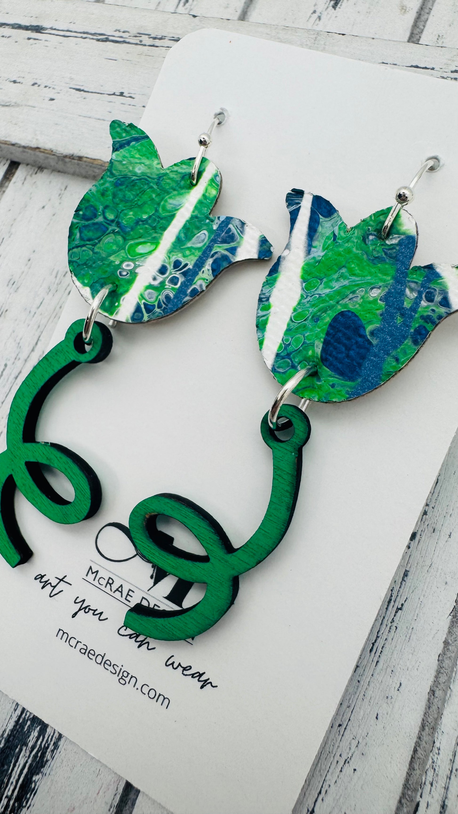 Meet Surfer Girl — a dreamy, salt-kissed collection of wearable art inspired by the shimmer of ocean waves and the nostalgia of endless summer days. Every pair begins as a hand-painted canvas, then carefully cut into oceanic silhouettes like mermaid tails, turtles, and sand dollars. With metallic navy blues, vibrant kelly greens, soft Carolina blue, and bright whites, these earrings echo the rhythm of tides and the sparkle of sunlight on the sea.
