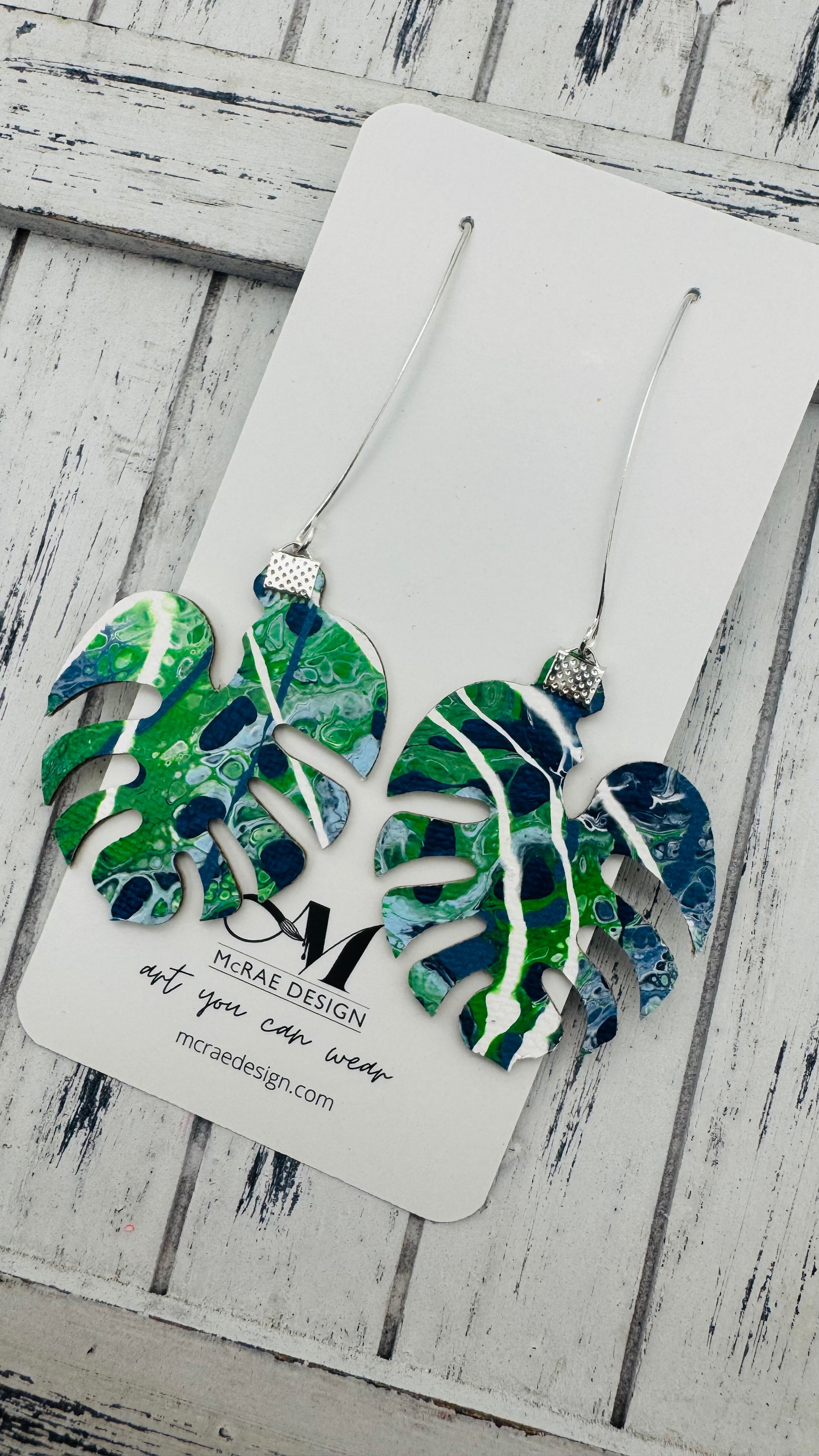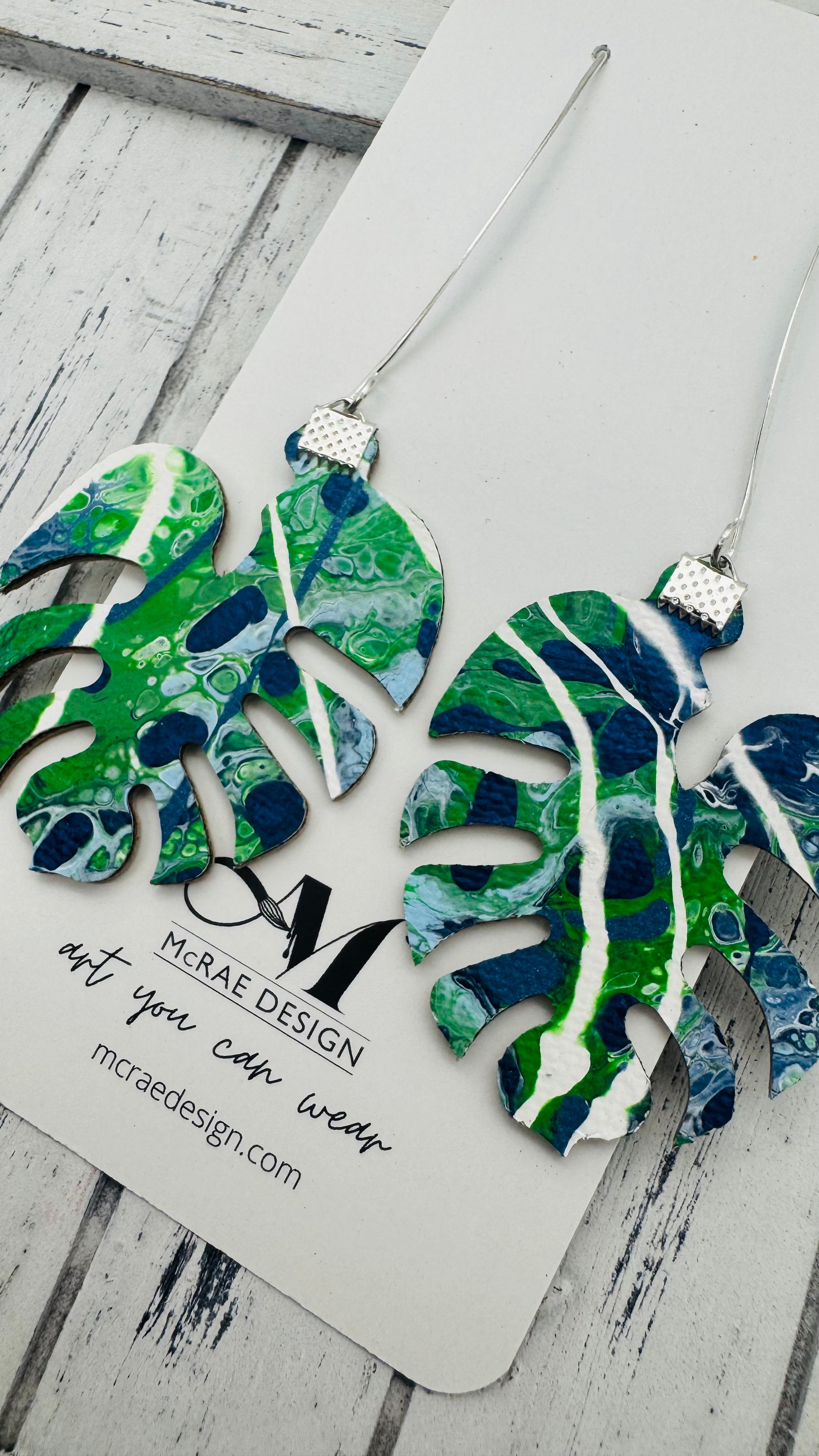 Meet Surfer Girl — a dreamy, salt-kissed collection of wearable art inspired by the shimmer of ocean waves and the nostalgia of endless summer days. Every pair begins as a hand-painted canvas, then carefully cut into oceanic silhouettes like mermaid tails, turtles, and sand dollars. With metallic navy blues, vibrant kelly greens, soft Carolina blue, and bright whites, these earrings echo the rhythm of tides and the sparkle of sunlight on the sea.