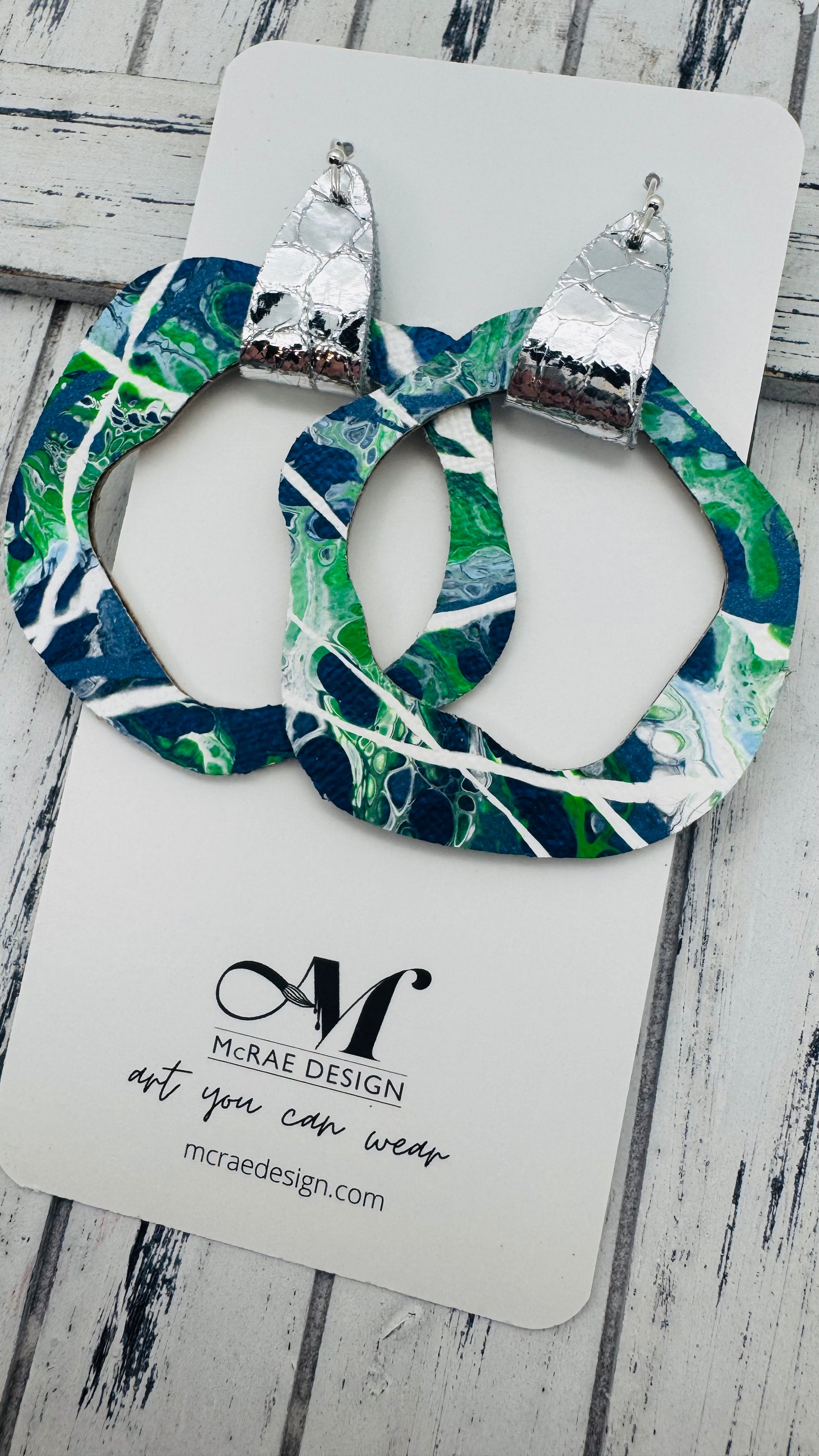 Meet Surfer Girl — a dreamy, salt-kissed collection of wearable art inspired by the shimmer of ocean waves and the nostalgia of endless summer days. Every pair begins as a hand-painted canvas, then carefully cut into oceanic silhouettes like mermaid tails, turtles, and sand dollars. With metallic navy blues, vibrant kelly greens, soft Carolina blue, and bright whites, these earrings echo the rhythm of tides and the sparkle of sunlight on the sea.