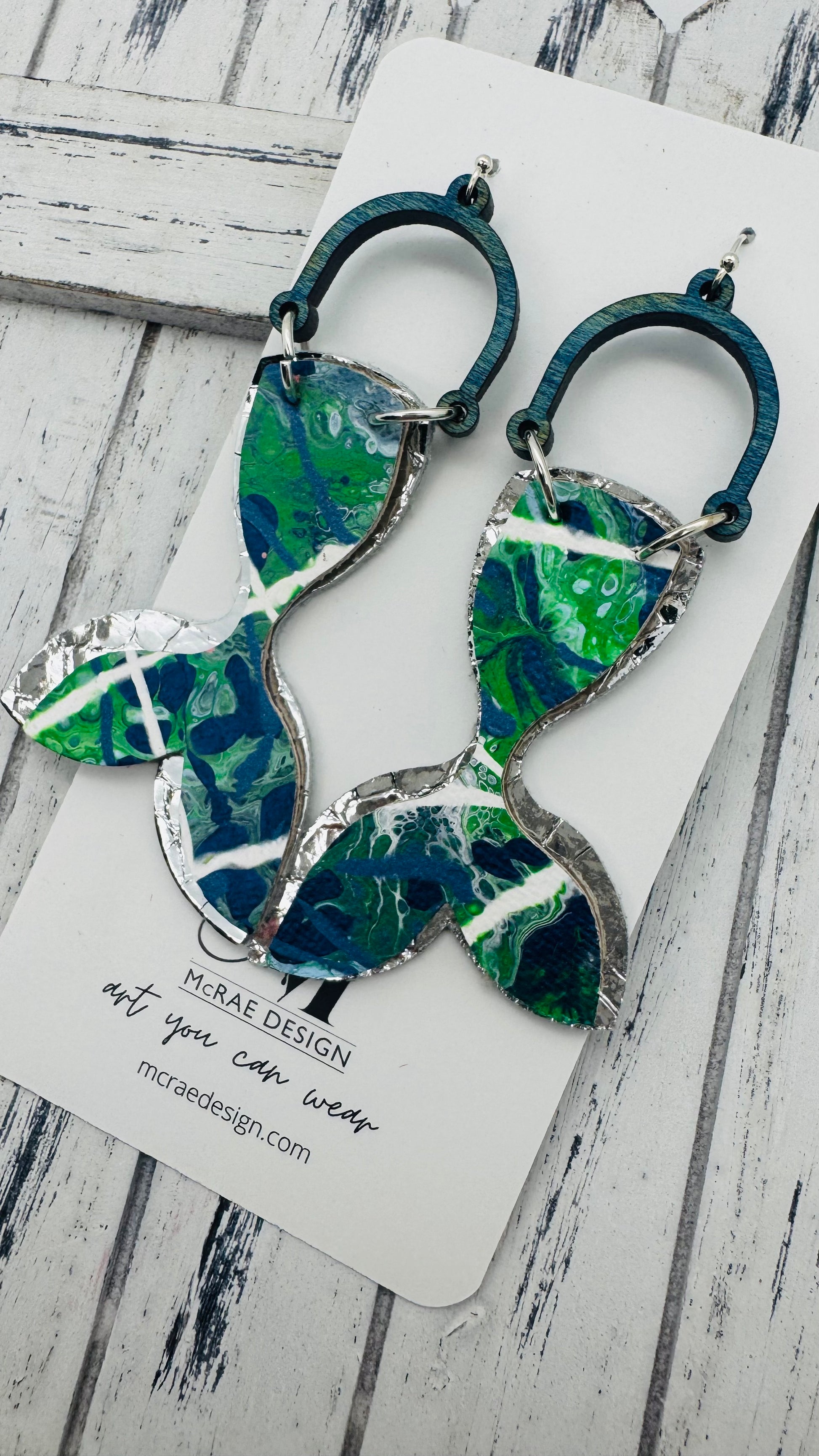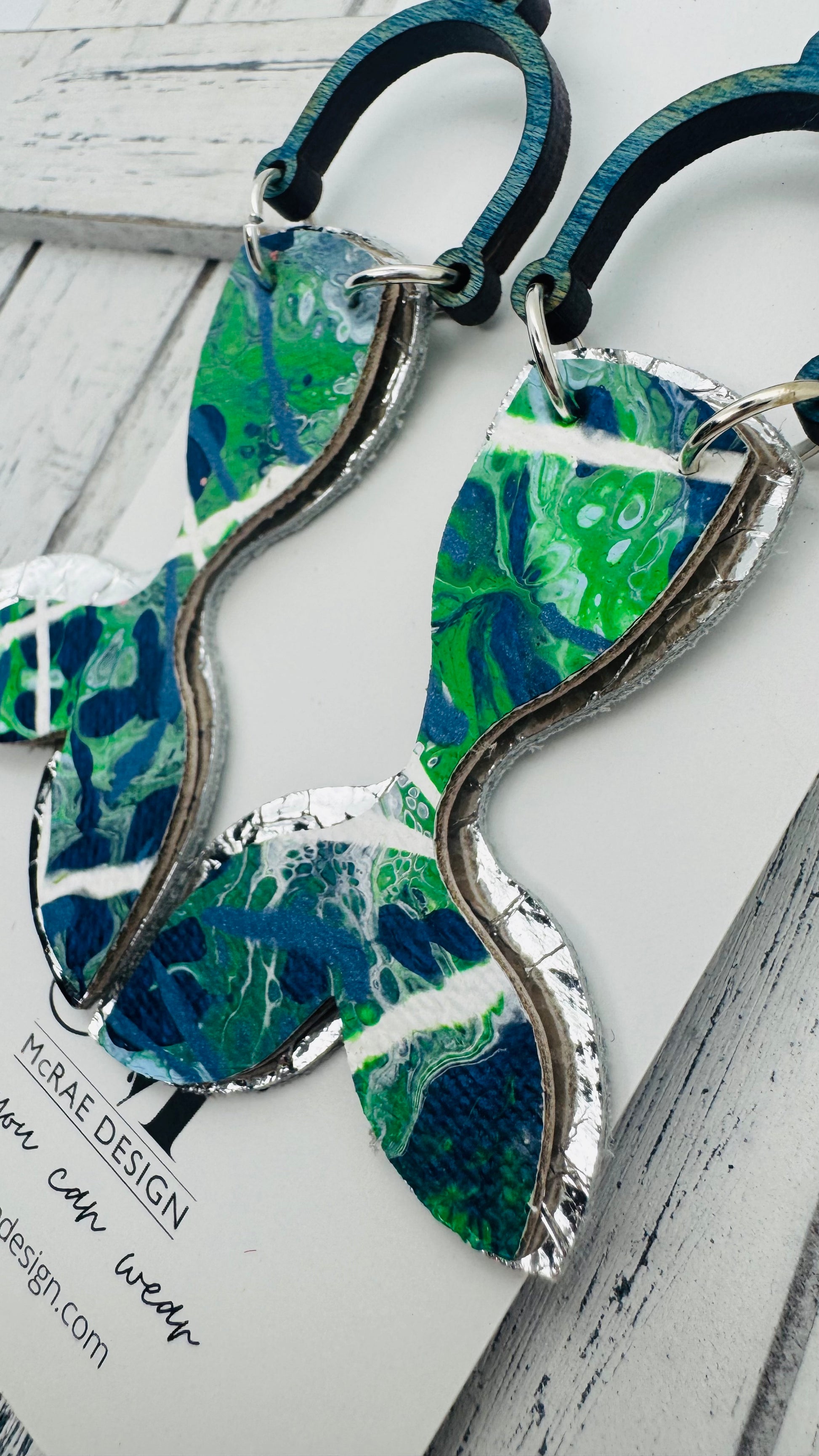 Meet Surfer Girl — a dreamy, salt-kissed collection of wearable art inspired by the shimmer of ocean waves and the nostalgia of endless summer days. Every pair begins as a hand-painted canvas, then carefully cut into oceanic silhouettes like mermaid tails, turtles, and sand dollars. With metallic navy blues, vibrant kelly greens, soft Carolina blue, and bright whites, these earrings echo the rhythm of tides and the sparkle of sunlight on the sea.