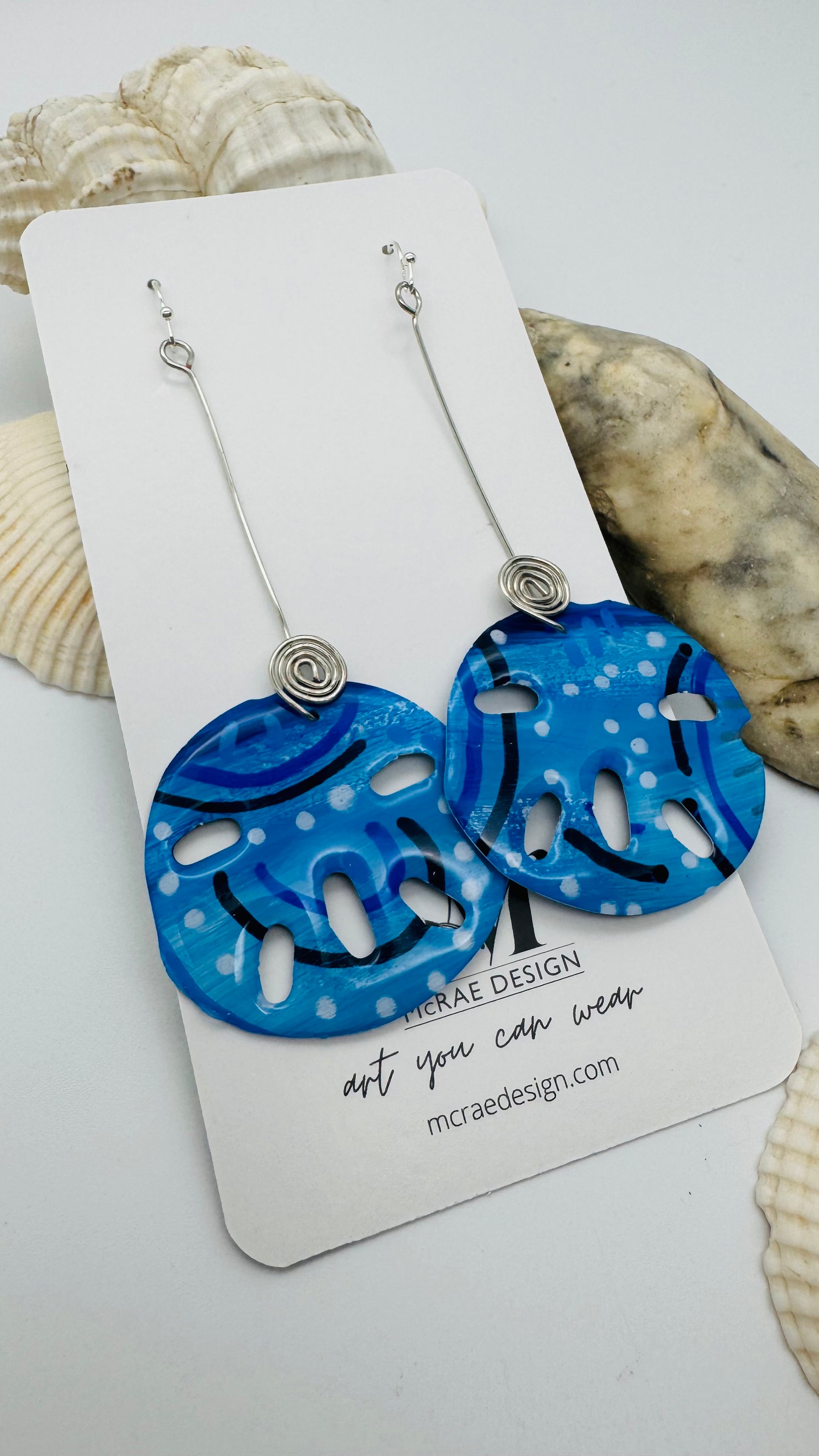 All the ocean blues painted onto paper. Coated on both side with resin to make them shiny and durable. Guaranteed to bring you compliments and add a little summer to any day. Pairs perfectly with almost any outfit - they will look great with jean to a dress.