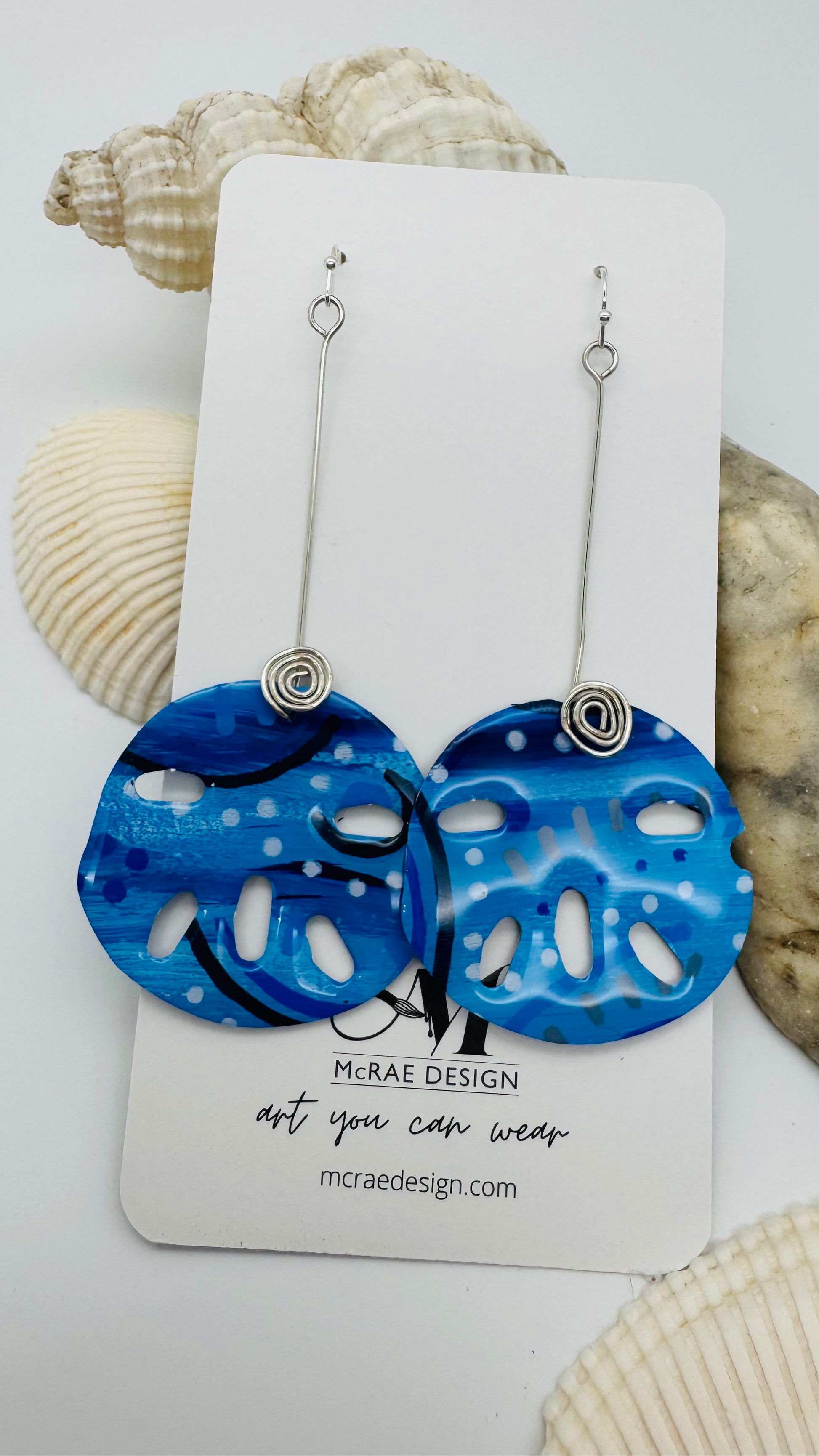 All the ocean blues painted onto paper.  Coated on both side with resin to make them shiny and durable. Guaranteed to bring you compliments and add a little summer to any day. Pairs perfectly with almost any outfit - they will look great with jean to a dress.