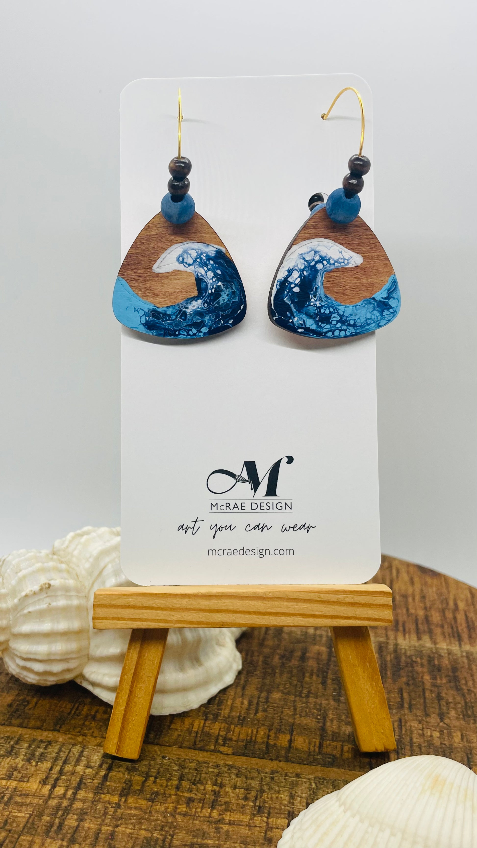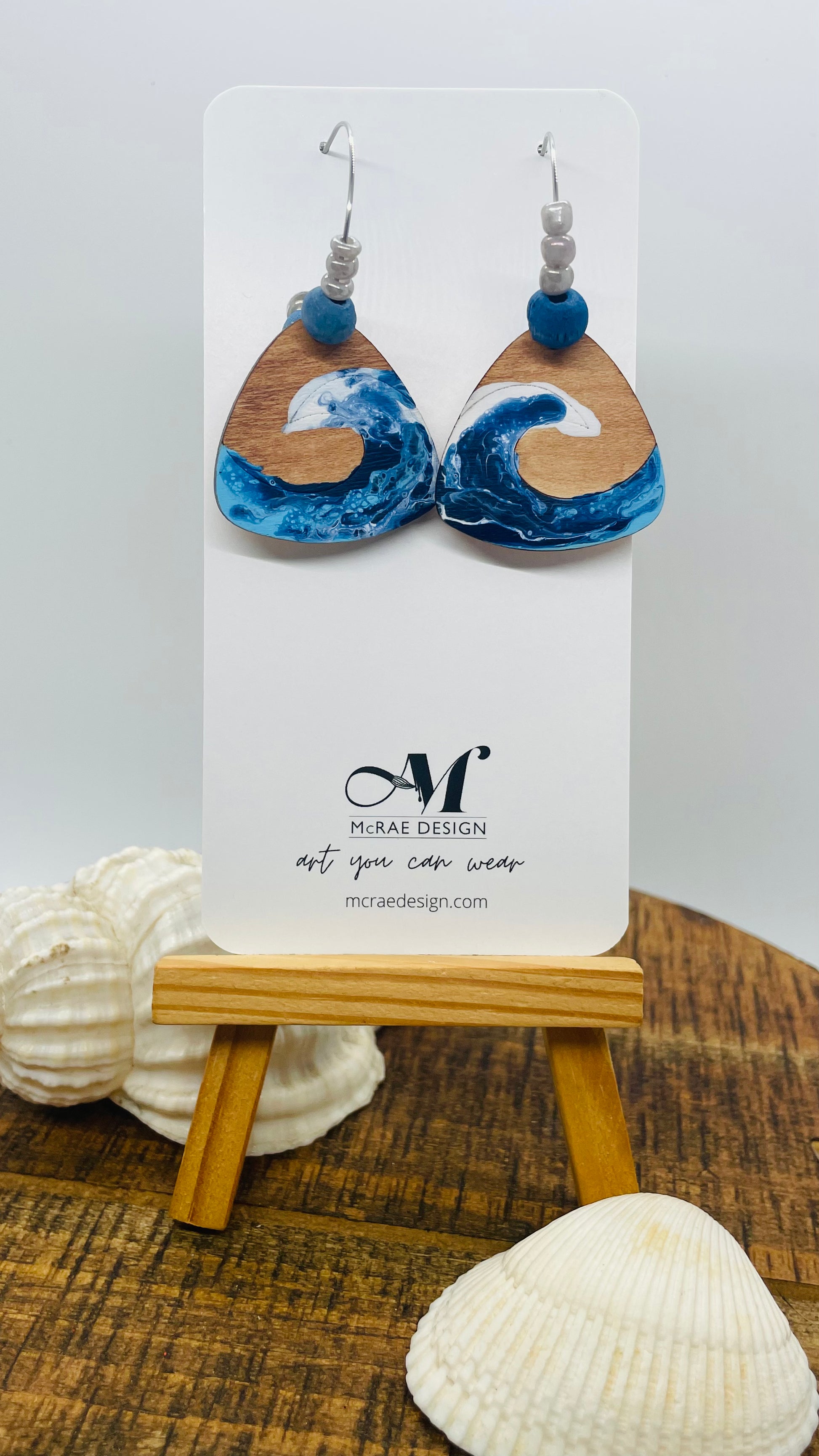 I’ve had these earrings on my mind since I first started painting and finally got the method just right. Wooden ovals and guitar pick shapes with hand painted waves of royal, sky blue white.