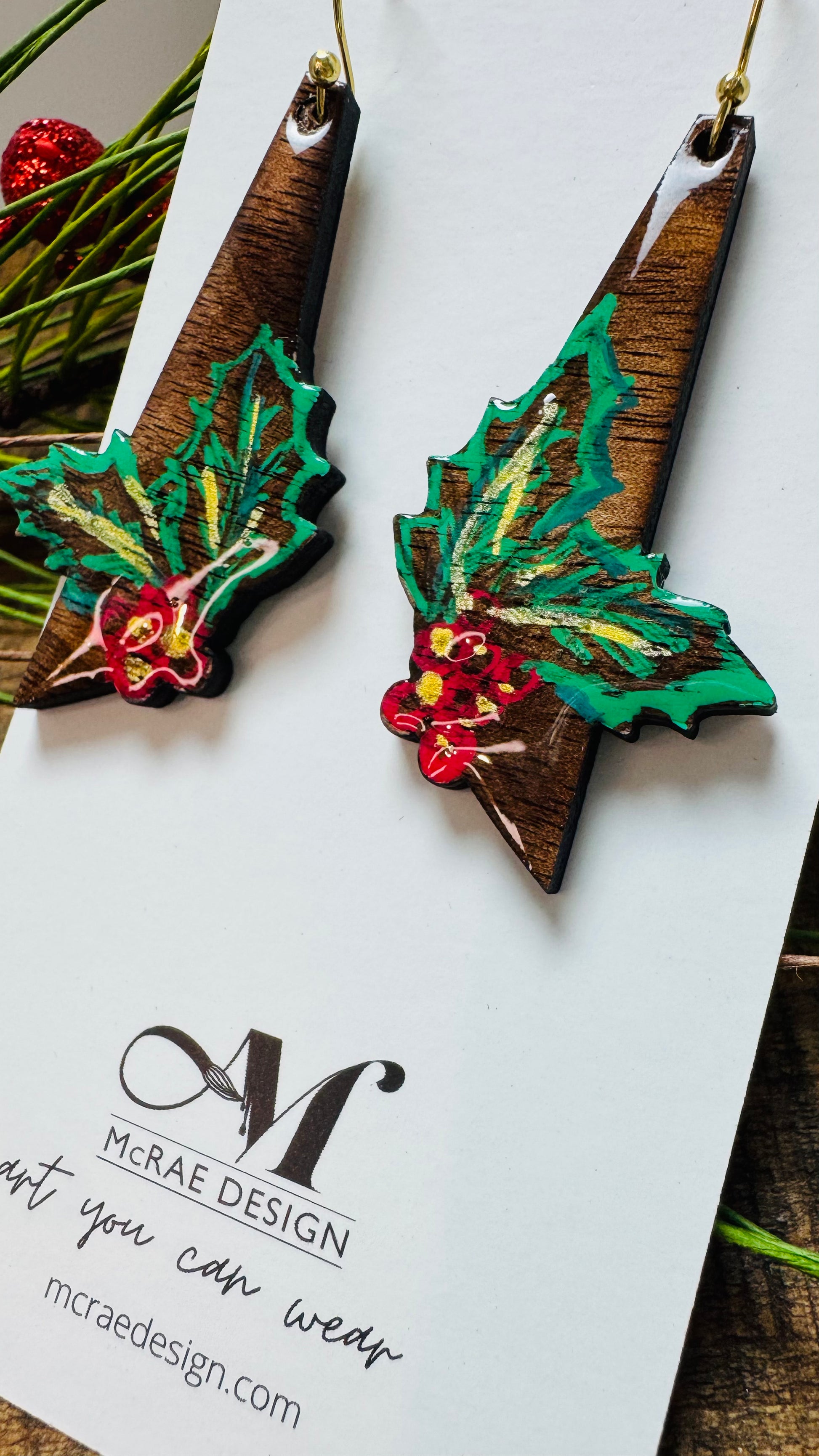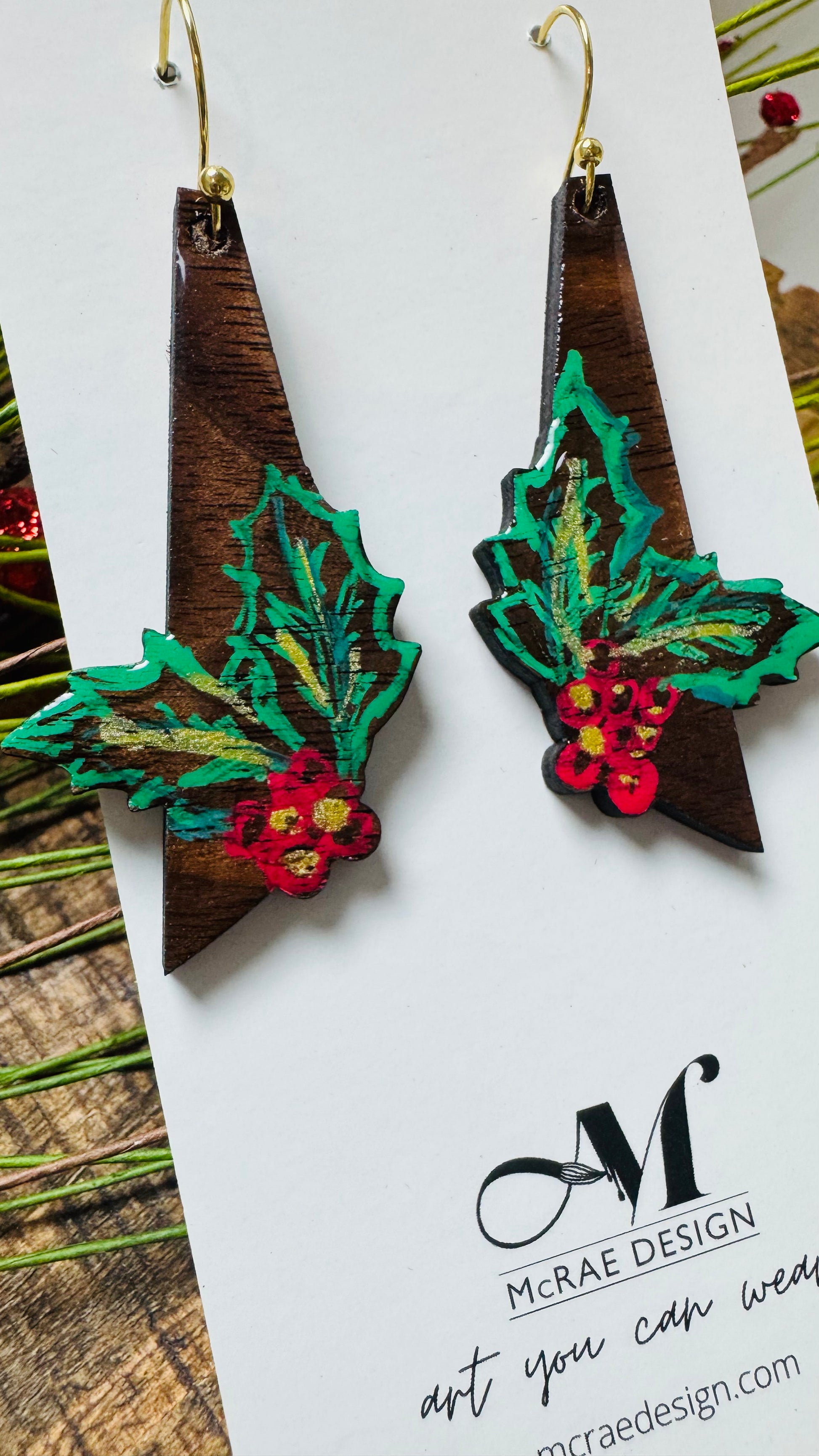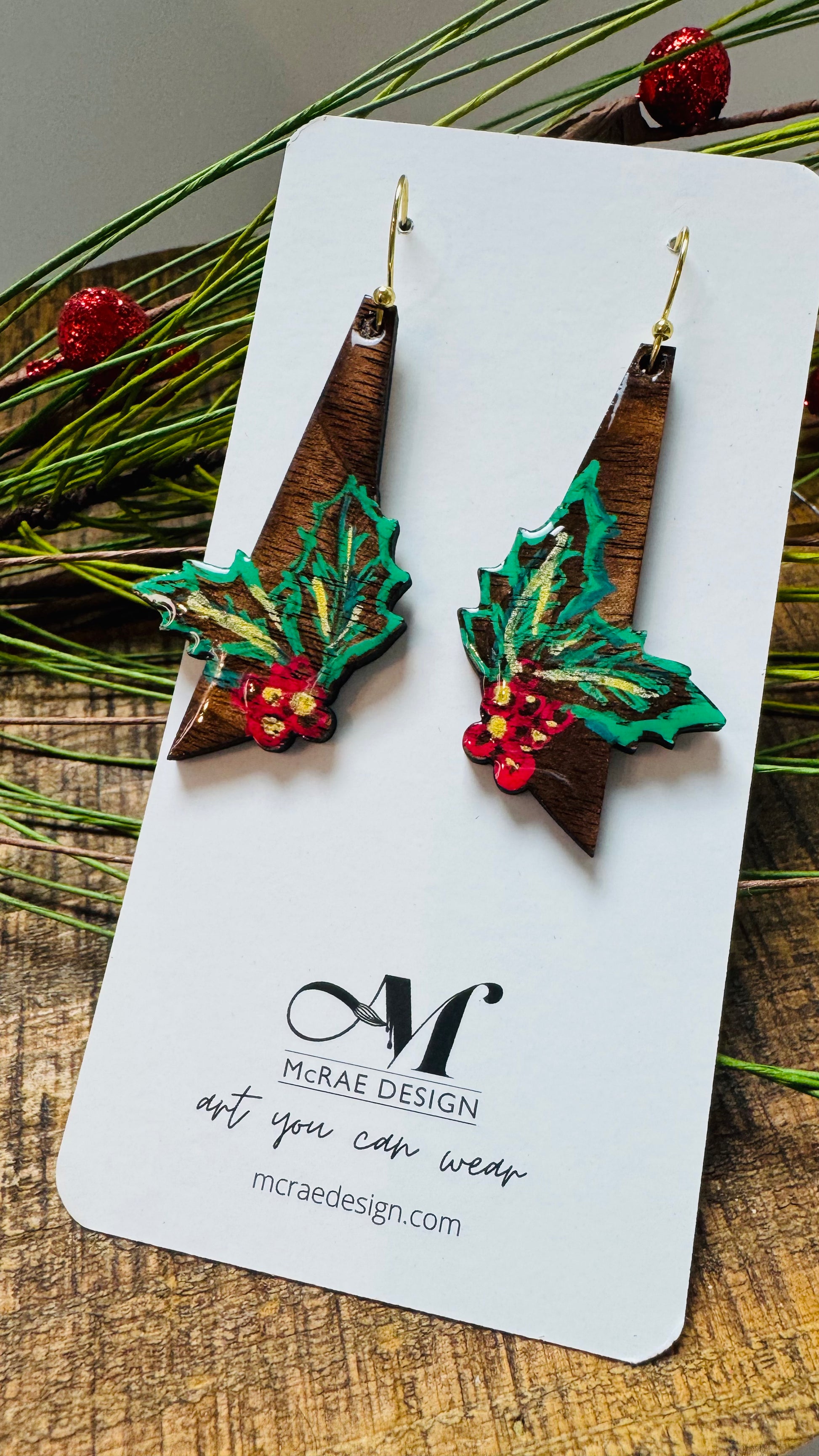 Painted on Black Walnut with gold accents, sealed with resin for a shiny finish. On 14k gold plated hook. Total length is approximately 2.5 inches.