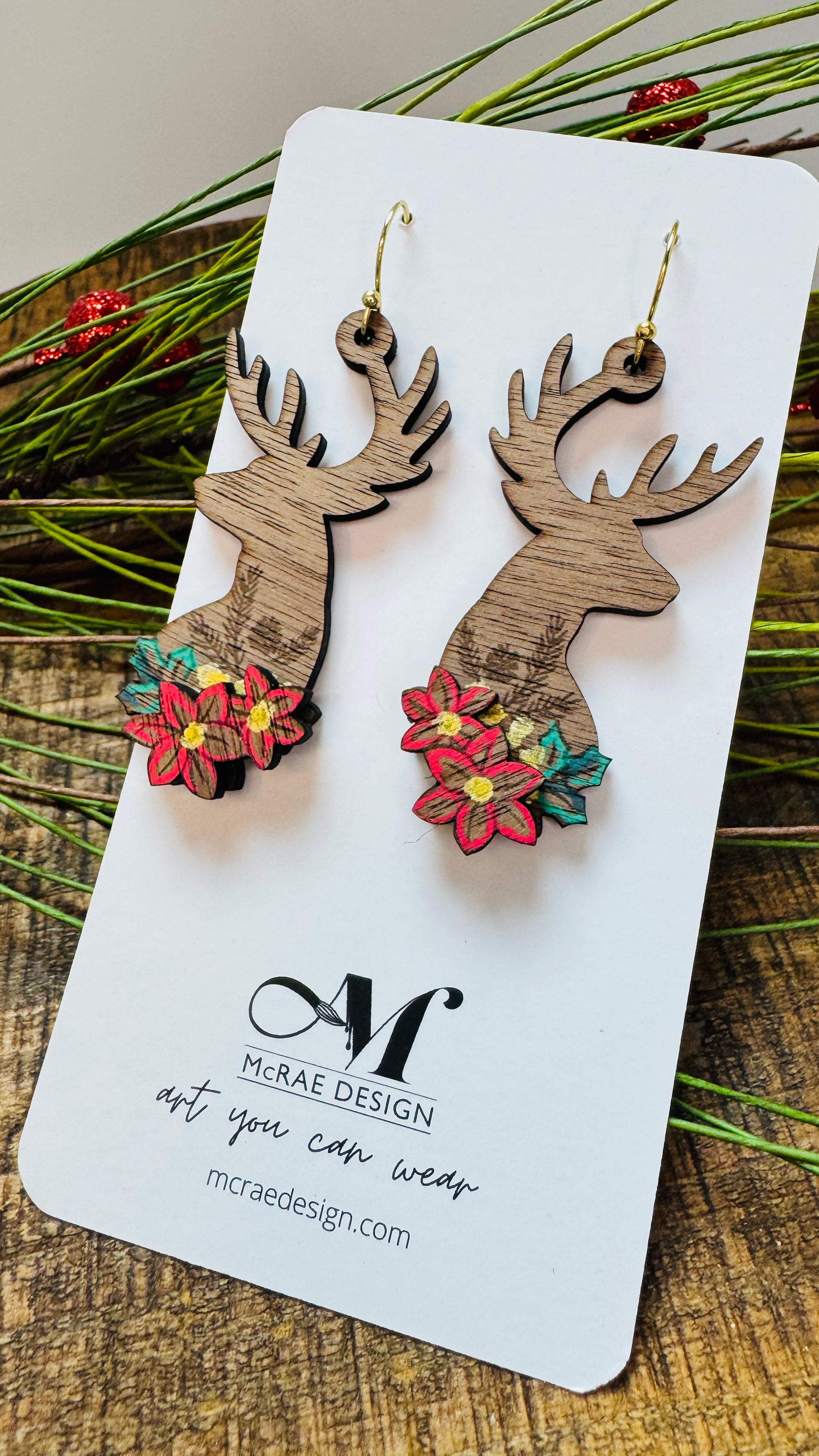 Painted on Black Walnut with dimension poinsettia. On 14k gold hooks. Total length is approximately 3.5 inches.