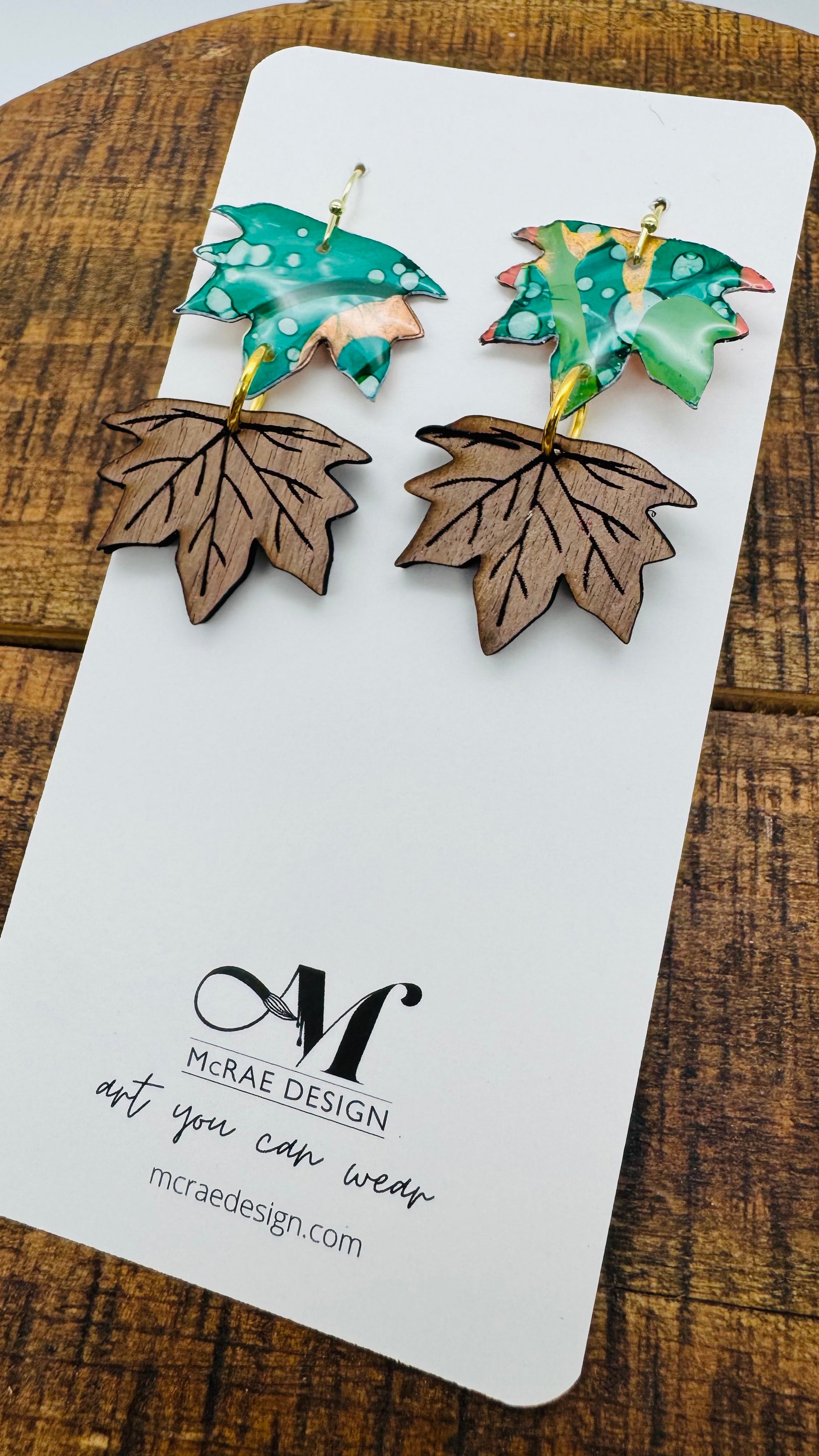 The Woodland Whimsy collection captures the magic of the forest in every detail. Each piece begins as an original painting on paper, alive with vibrant colors and organic textures. These artworks are then hand-cut into delicate leaf shapes and paired with the natural elegance of laser-cut black walnut. The fusion of painted patterns with the rich grain of wood creates jewelry that feels both modern and timeless—an homage to autumn’s beauty and nature’s artistry.