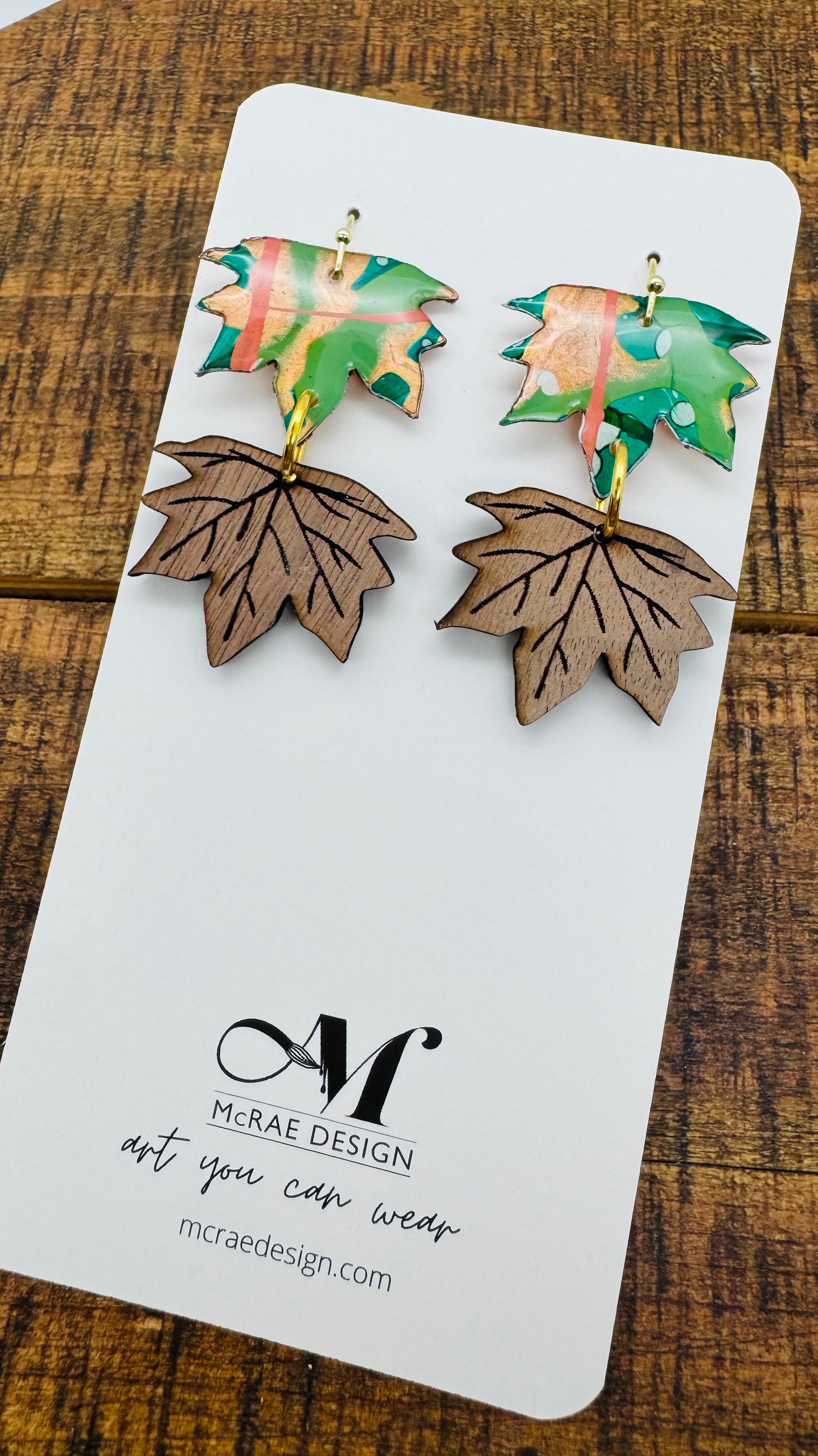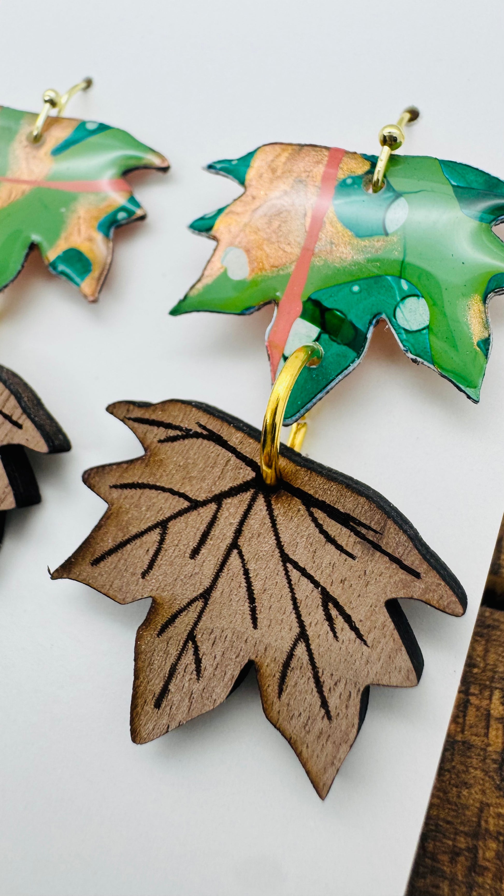 The Woodland Whimsy collection captures the magic of the forest in every detail. Each piece begins as an original painting on paper, alive with vibrant colors and organic textures. These artworks are then hand-cut into delicate leaf shapes and paired with the natural elegance of laser-cut black walnut. The fusion of painted patterns with the rich grain of wood creates jewelry that feels both modern and timeless—an homage to autumn’s beauty and nature’s artistry.