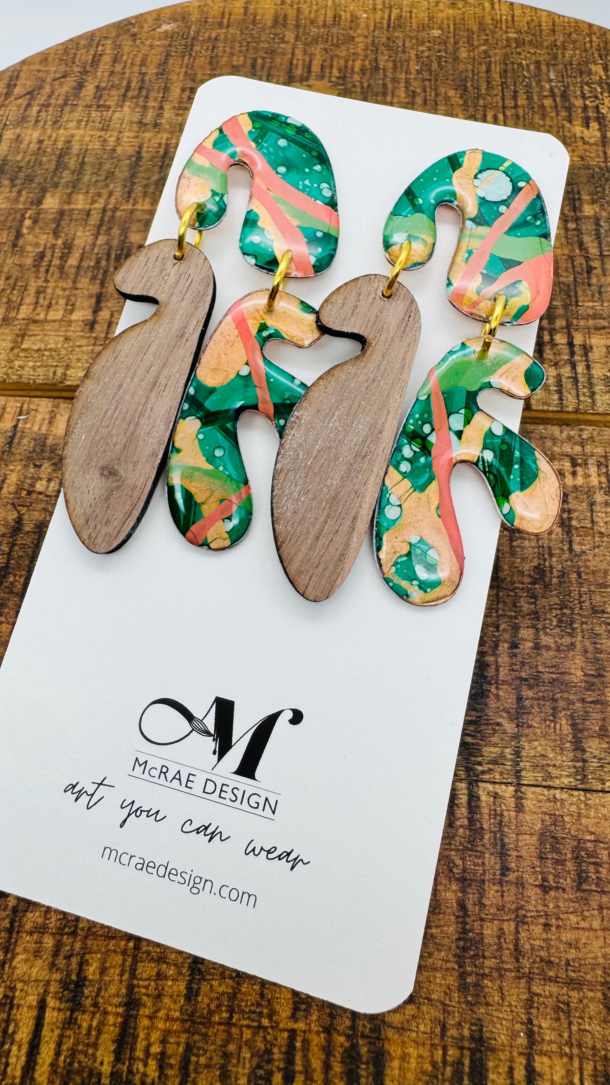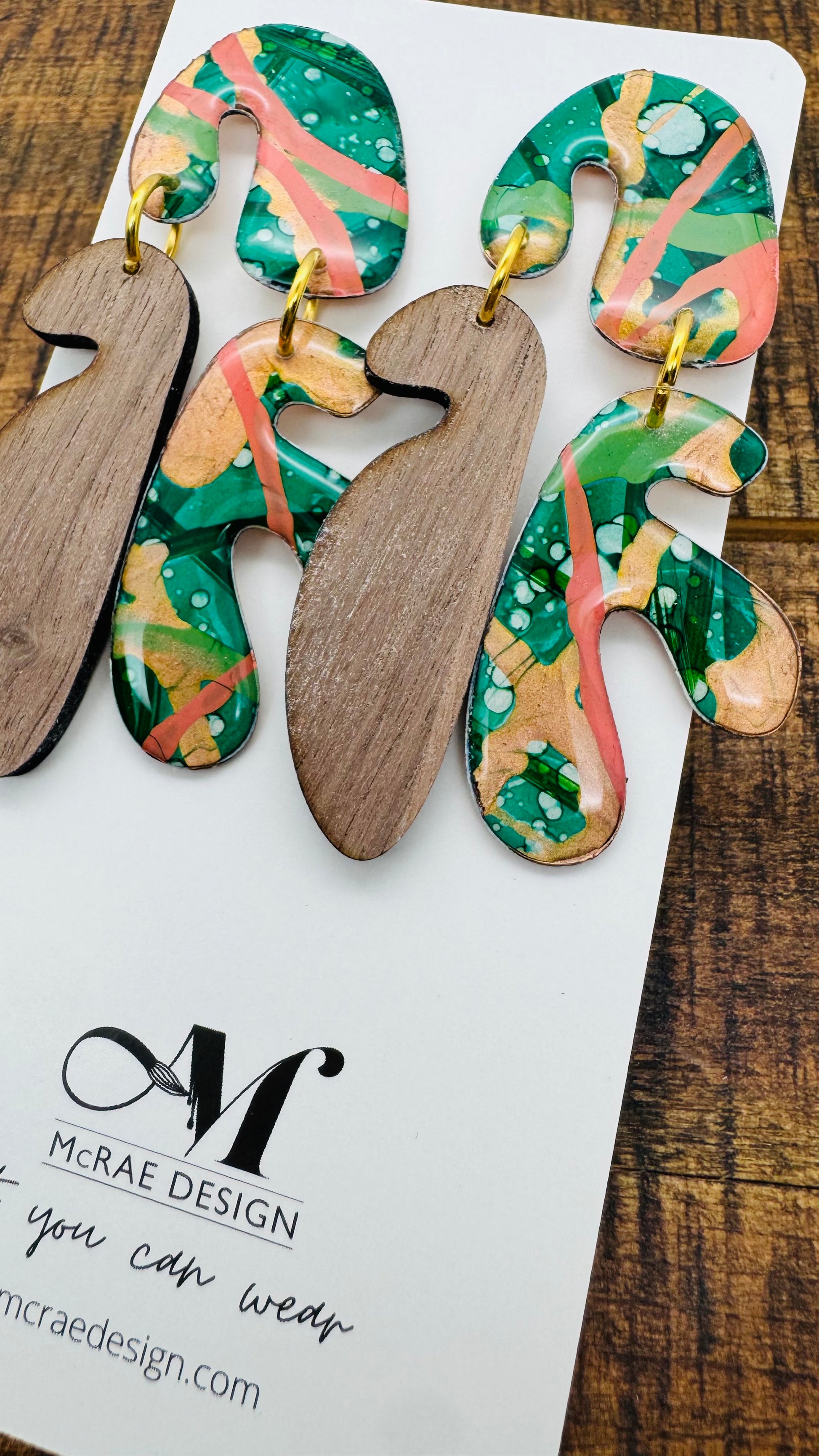 The Woodland Whimsy collection captures the magic of the forest in every detail. Each piece begins as an original painting on paper, alive with vibrant colors and organic textures. These artworks are then hand-cut into delicate leaf shapes and paired with the natural elegance of laser-cut black walnut. The fusion of painted patterns with the rich grain of wood creates jewelry that feels both modern and timeless—an homage to autumn’s beauty and nature’s artistry.