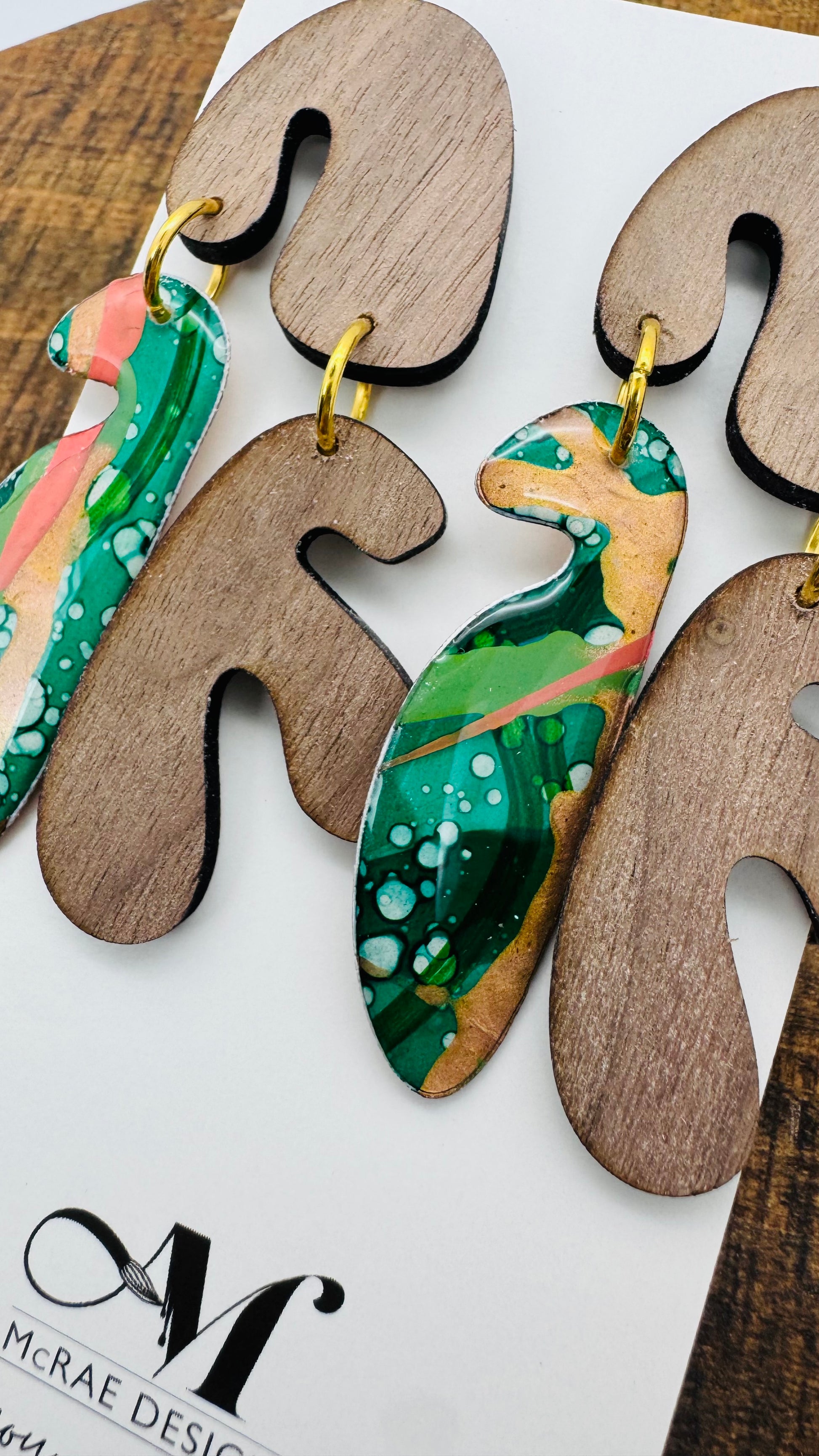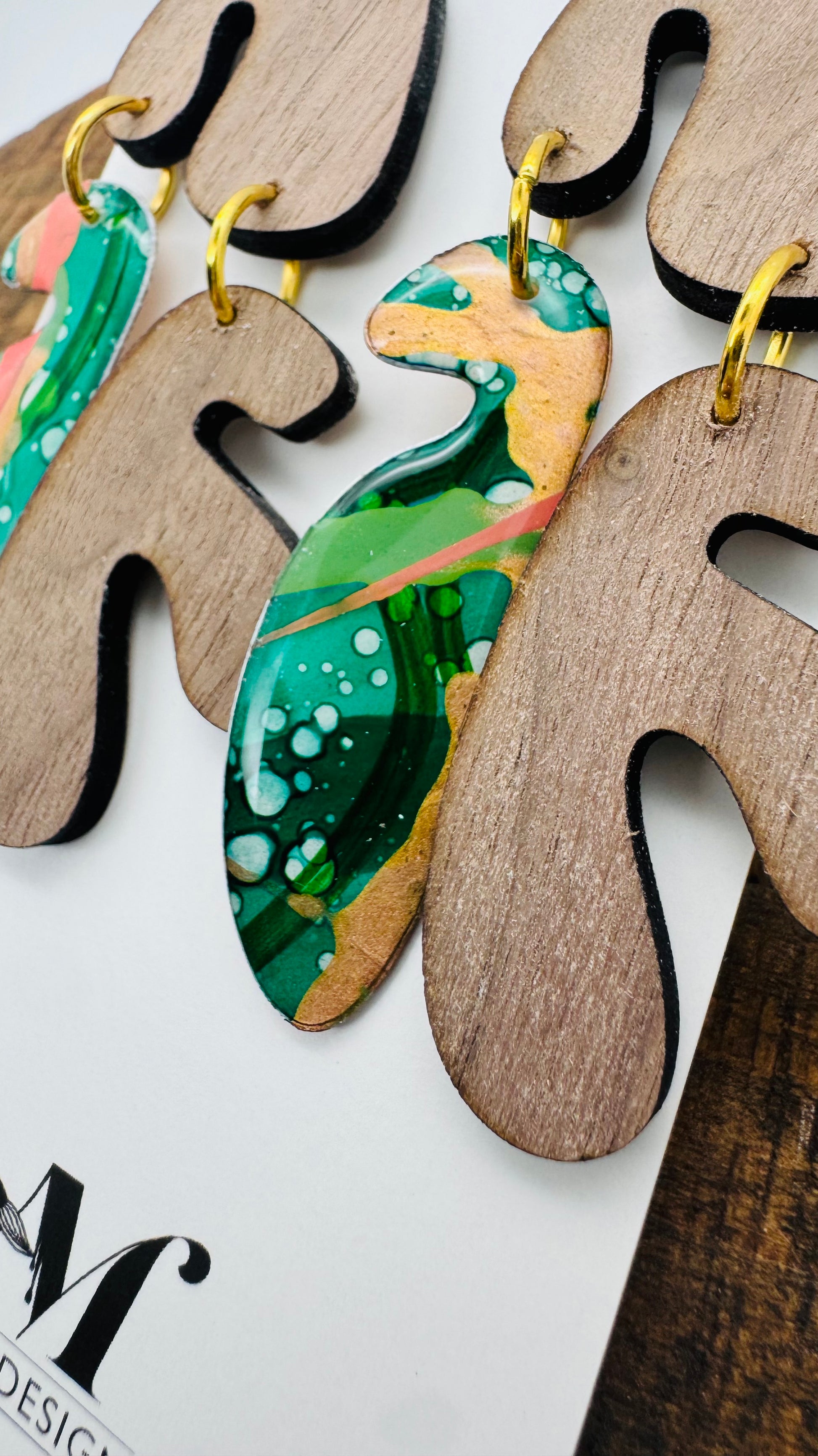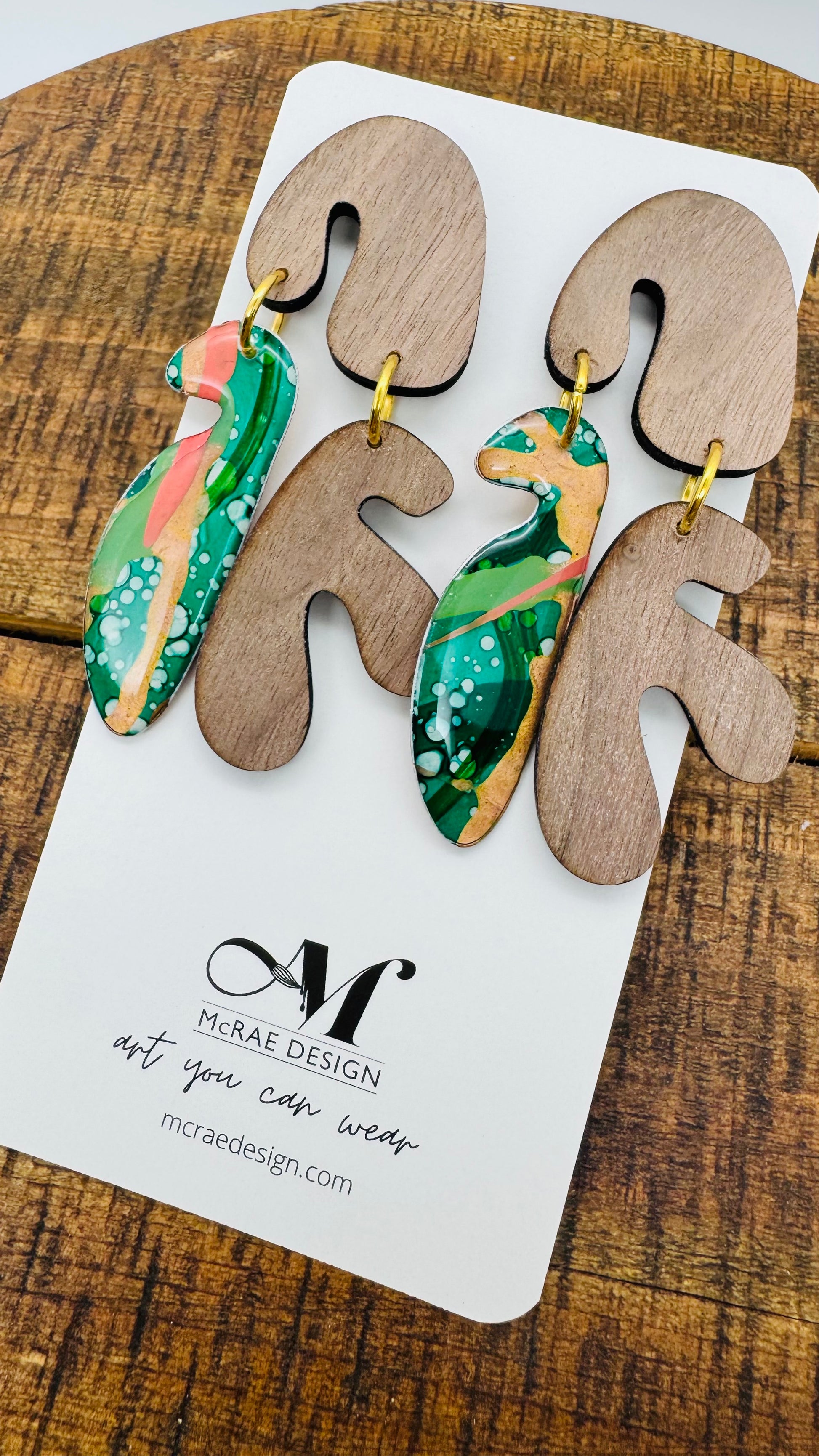 The Woodland Whimsy collection captures the magic of the forest in every detail. Each piece begins as an original painting on paper, alive with vibrant colors and organic textures. These artworks are then hand-cut into delicate leaf shapes and paired with the natural elegance of laser-cut black walnut. The fusion of painted patterns with the rich grain of wood creates jewelry that feels both modern and timeless—an homage to autumn’s beauty and nature’s artistry.